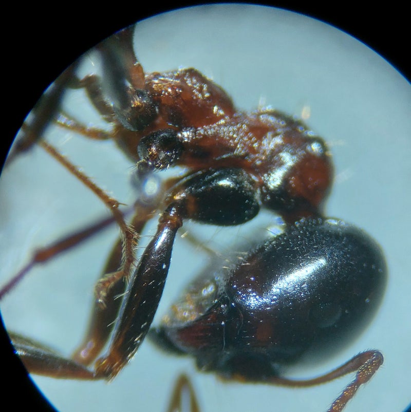 Couleur : fourmis toute noir avec du rouge sombre sur le thorax.